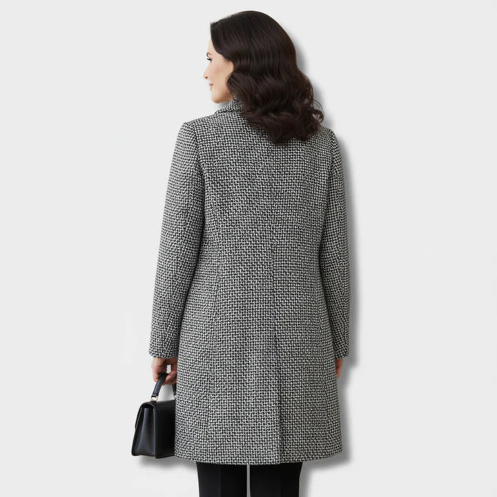 Este abrigo de tejido estructurado destaca por su patrón clásico y su silueta refinada, convirtiéndose en una pieza imprescindible para la temporada. Su interior acolchado aporta calidez sin añadir peso, mientras los botones frontales y el corte recto estilizan la figura con un aire moderno y sofisticado. Ideal para combinar con outfits casuales o más formales, es una prenda versátil que ofrece estilo y comodidad en igual medida.
