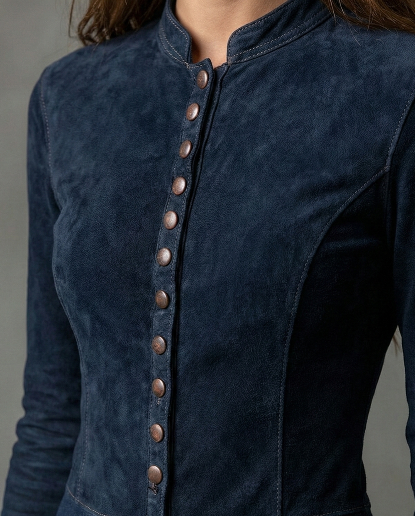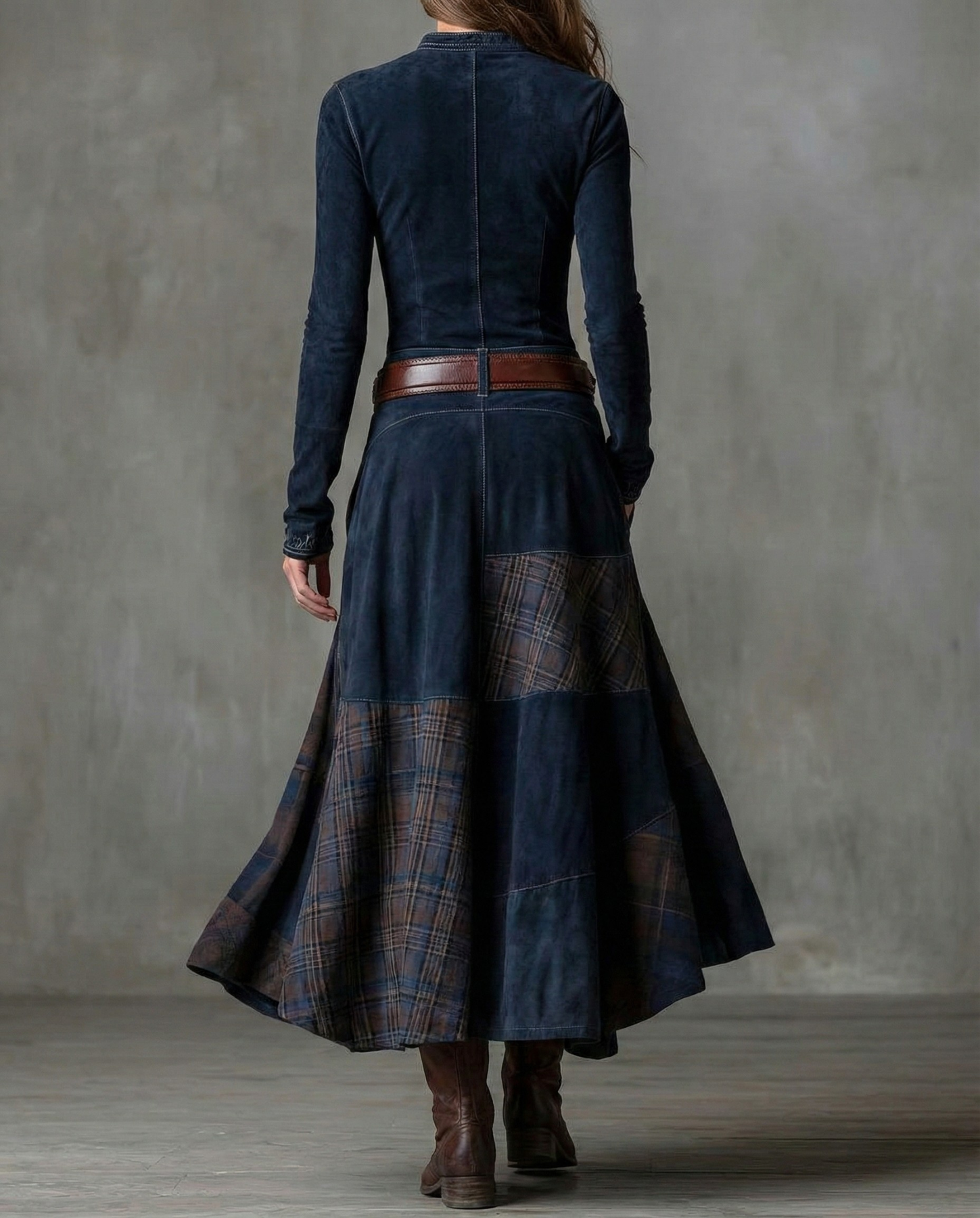 Este vestido largo de inspiración boho chic combina la suavidad del acabado ante con un diseño entallado en la parte superior y una falda amplia con paneles a cuadros que aportan movimiento y carácter. Su silueta estilizada, el cuello alto con botones decorativos y el cinturón realzan la figura, creando un look femenino, moderno y lleno de personalidad. Perfecto para quienes buscan una prenda única que destaque tanto de día como de noche.